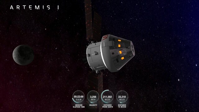 Orion is 211,582 miles from Earth, 22,218 miles from the Moon, cruising at 3,256 miles per hour.