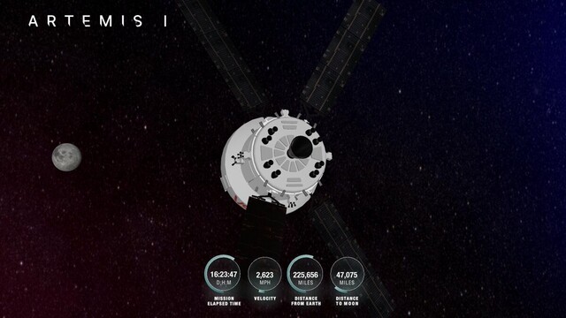 Orion is 225,656 mi from Earth, 47,075 mi from the Moon, cruising at 2,623 mph.