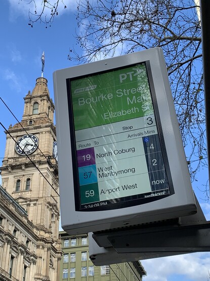 Waiting for a 59 tram. I have noticed that when you're at a stop near a terminus, these displays act more like aspirational "serving suggestions" until the tram actually departs. I just saw what I think is my tram pass by on the other side, inbound, and I'm sure it'll take more than 1 minute until it gets to me here. #Melbourne #Tram #Trams