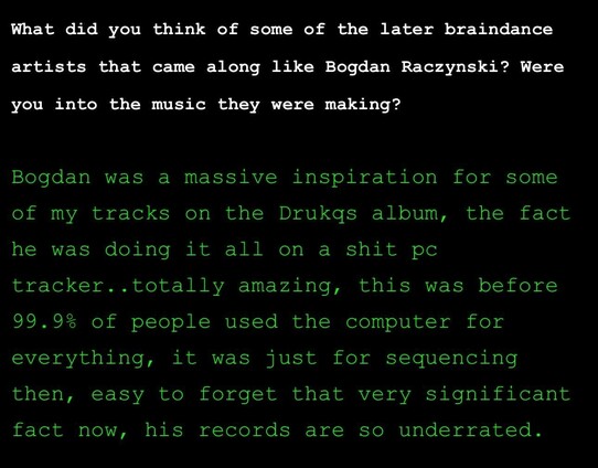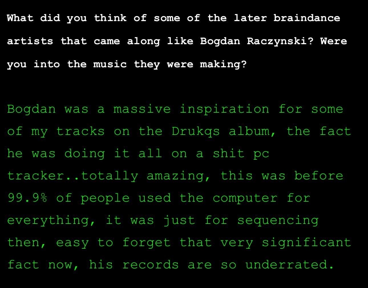 Excerpt from an interview with Aphex Twin that a friend shared. It's awesome seeing how much Richard admires Bogdan Raczynski. Bogdan was the first person who talked with me on #trax when I first joined the channel way back in the day. He DCCed me some of his tracks and I was completely blown away. Even early on he was doing amazing things with trackers totally unlike everyone else I had seen up to that point.