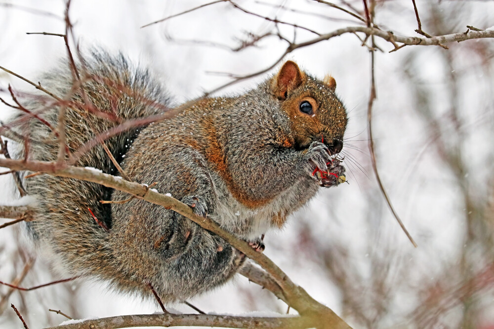 I watched this furry, bushy tailed Grey Squirrel for some time on a snowy #winter day in #Guelph #Ontario Canada. The squirrel moved from branch to branch eating the white berries one by one off the stem.