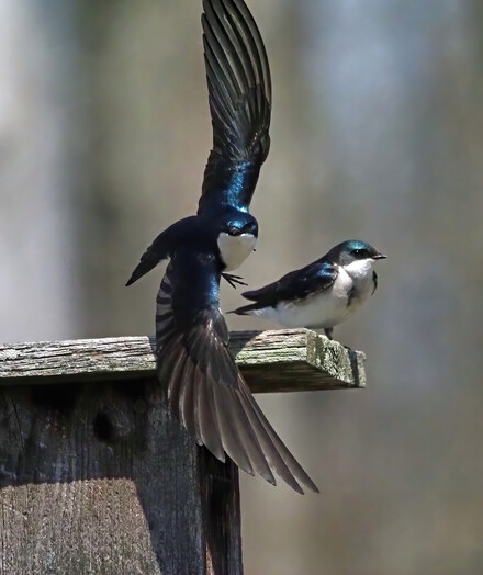 Tree swallows fighting over a nesting box in Jamaica Bay Wildlife Refuge.