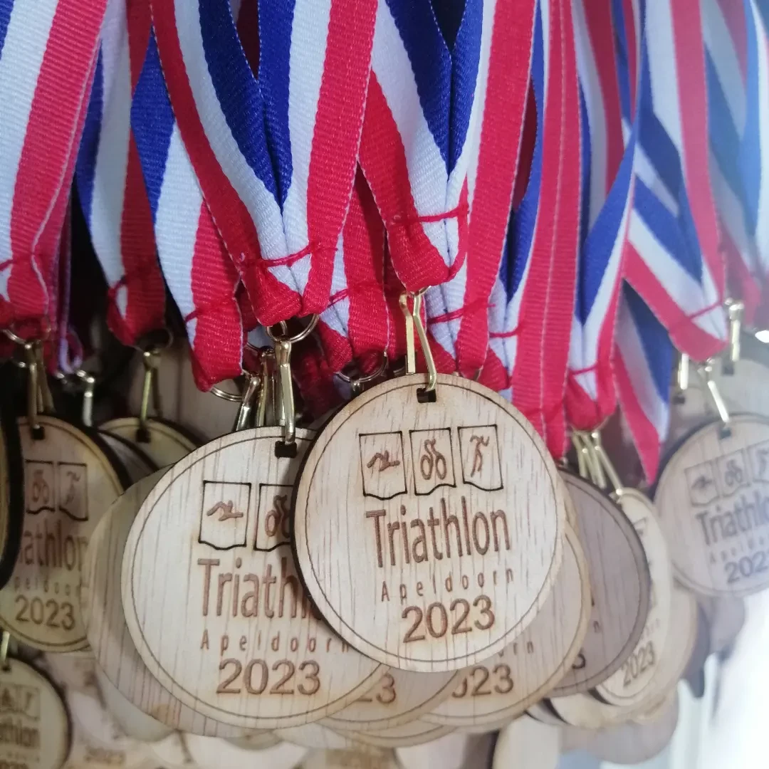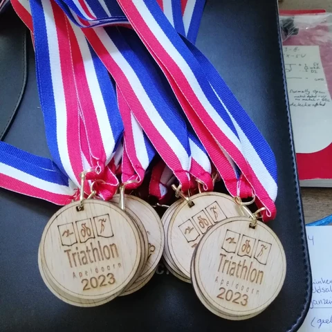 Iedere deelnemer op de 1/16e, 1/8e en 1/4e triathlon (excl competitie en Duchenne) krijgt straks bij de finish zo'n mooie medaille omgehangen.