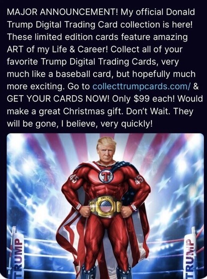 Ohne Witz, es handelt sich um Sammelkarten von ihm selbst! #Trumpcard Unfassbar! Der Narzisst braucht wohl Kohle für seinen Prozess !? https://twitter.com/ShotGun_Bonnie/status/1603431309724078086