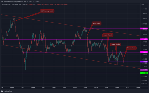 It trades between 1.40 and 2 dollars, except in the 1979 energy crisis and it's catastrophic results leaving the pound at it's all-time low.