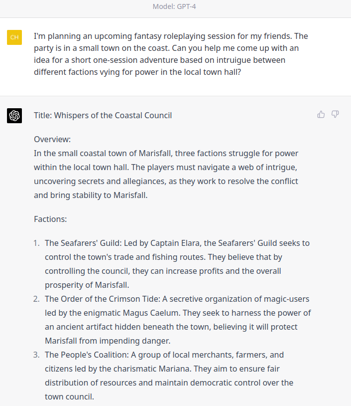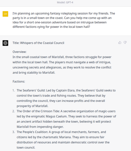 ChatGPT is a new AI tool which you can chat with. It sometimes gives you incorrect answers to questions, but it can also be used to help you come up with ideas. For example, if you're a GM, you can ask it to help you come up with plot lines based on prompts you give it. Check out this result when I asked it to help me come up with ideas just now. I don't know about you, but I'm impressed.