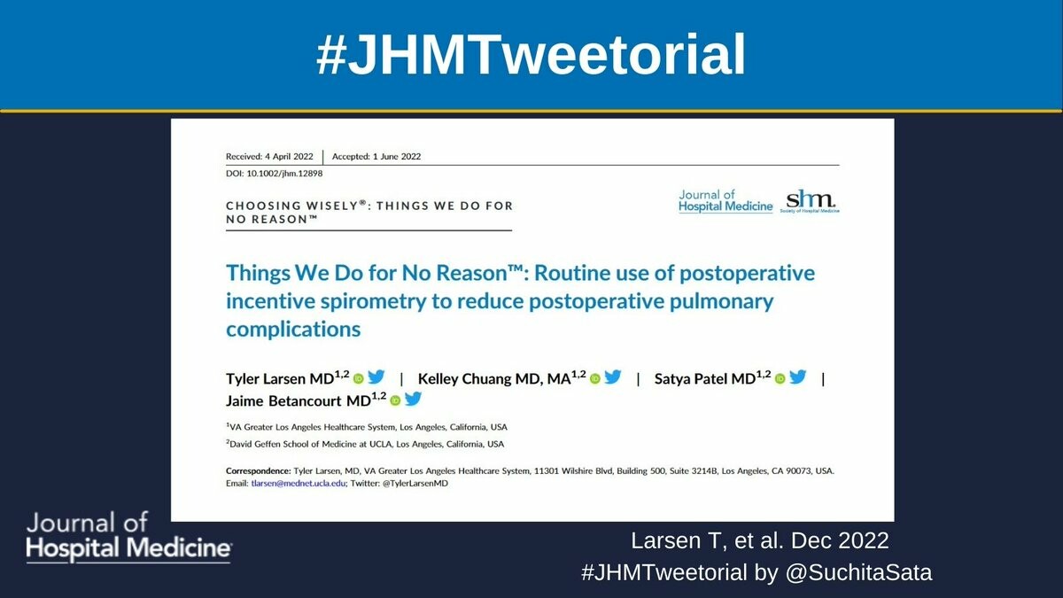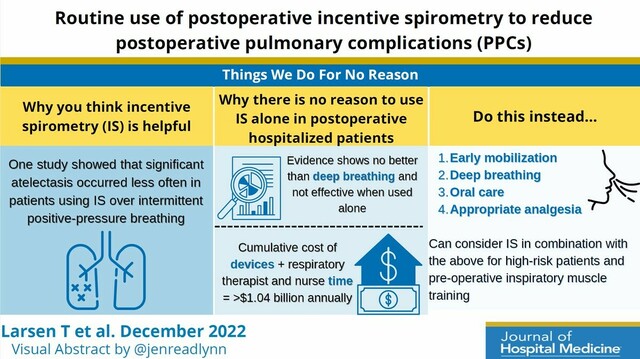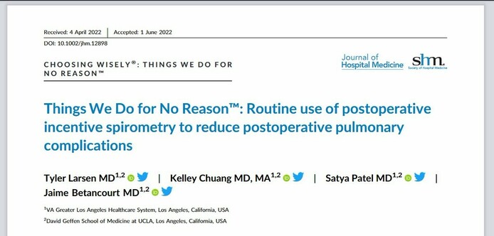 Things We Do For No Reason: Routine Use of Postoperative Incentive Spirometry to Reduce Postoperative Pulmonary Complications @TylerLarsenMD@twitter.com @kelleychuang@twitter.com @SatyaPatelMD@twitter.com @jaimebetancourt@twitter.com #TWDFNR