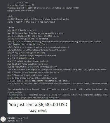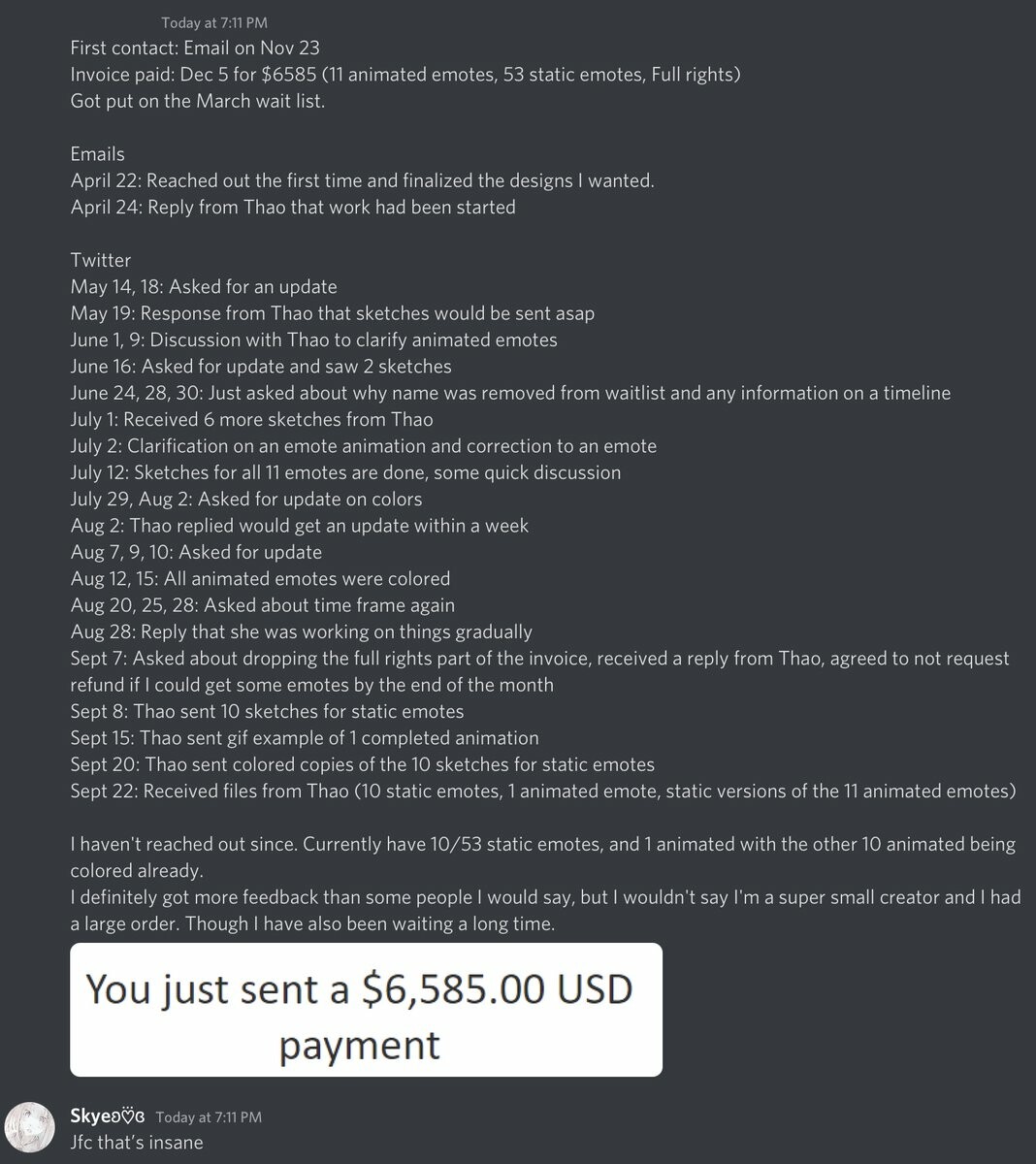 .@/Thaochibi4, a Twitch Partner and popular artist is stealing over 10,000$+ from her commissioners. While she continues to ignore / manipulate her smaller commissioners who have been waiting 1-2 years for their commission. https://www.twitlonger.com/show/n_1ss54m2?new_post=true #ENVtuber #TwitchEmoteArtist