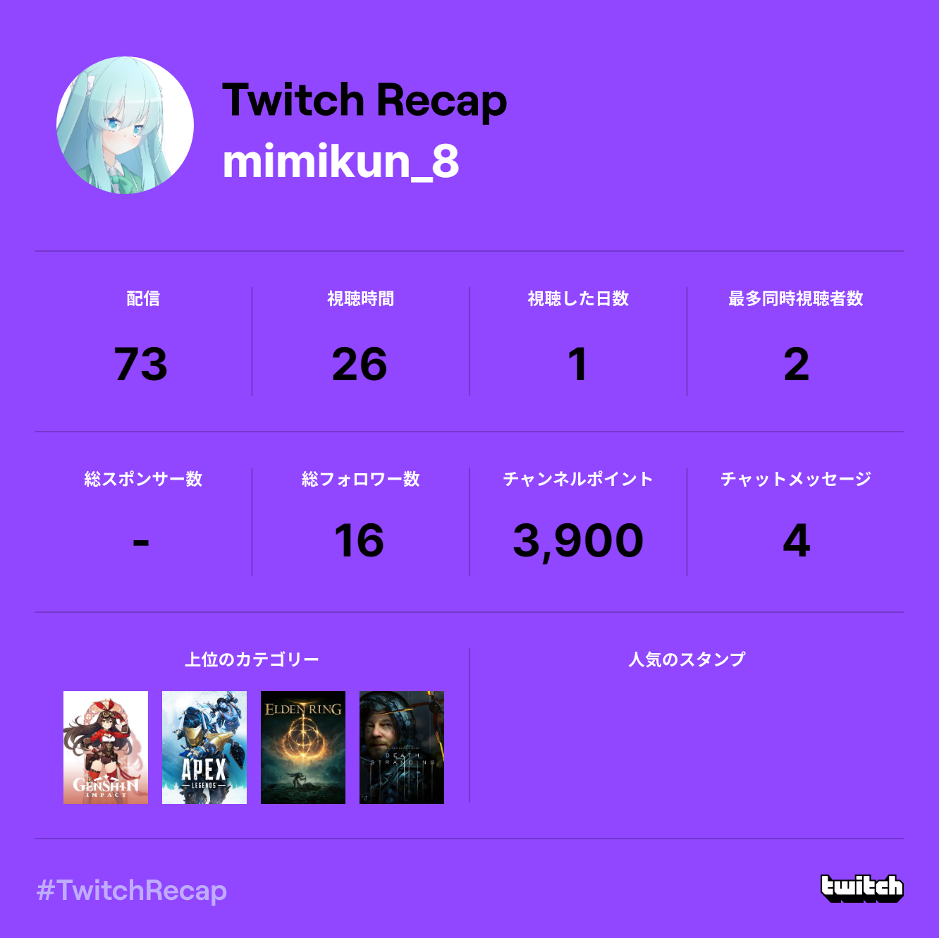 Here's my #TwitchRecap. I had a lot of fun this year. Here's hoping for even more good times this upcoming year!
