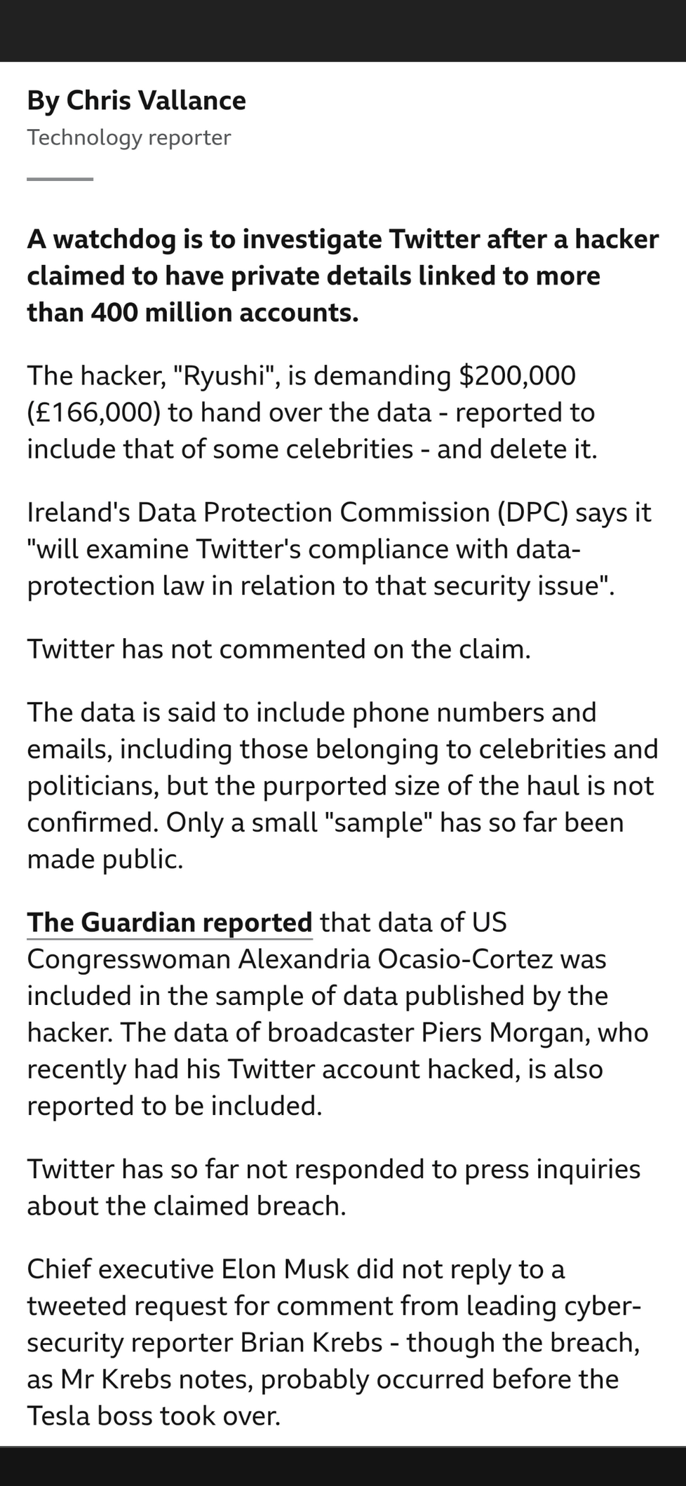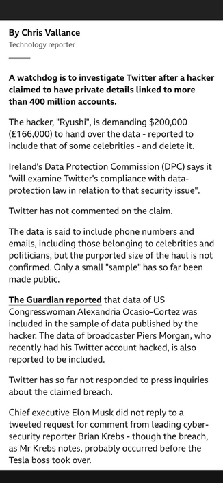 "A watchdog is to investigate #Twitter after a #hacker claimed to have private details linked to more than 400 million #accounts."