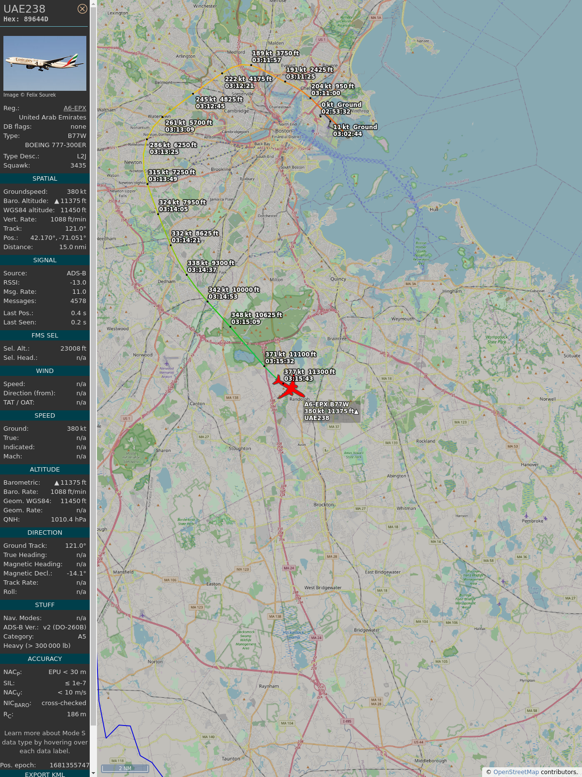 #89644f #uae238 #emiratesairlines #bos #dxb #planefence #adsb
