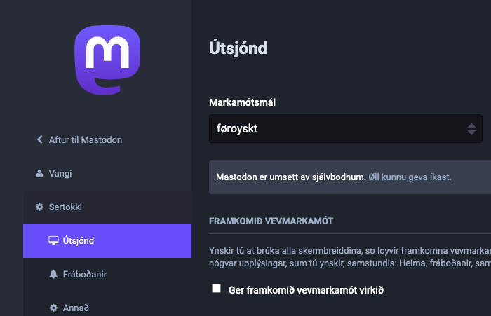 Brúk er fyri øllum góðum kreftum at umseta Mastodon til føroyskt. Tað verður gjørt inni á Crowdin, og øll kunnu vera við. Higartil er 4% umsett. https://crowdin.com/project/mastodon/fo #umseting #mastodon #efo