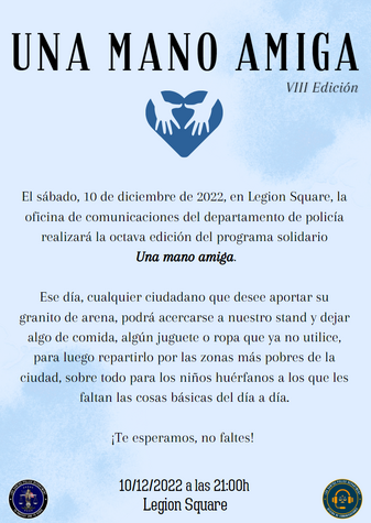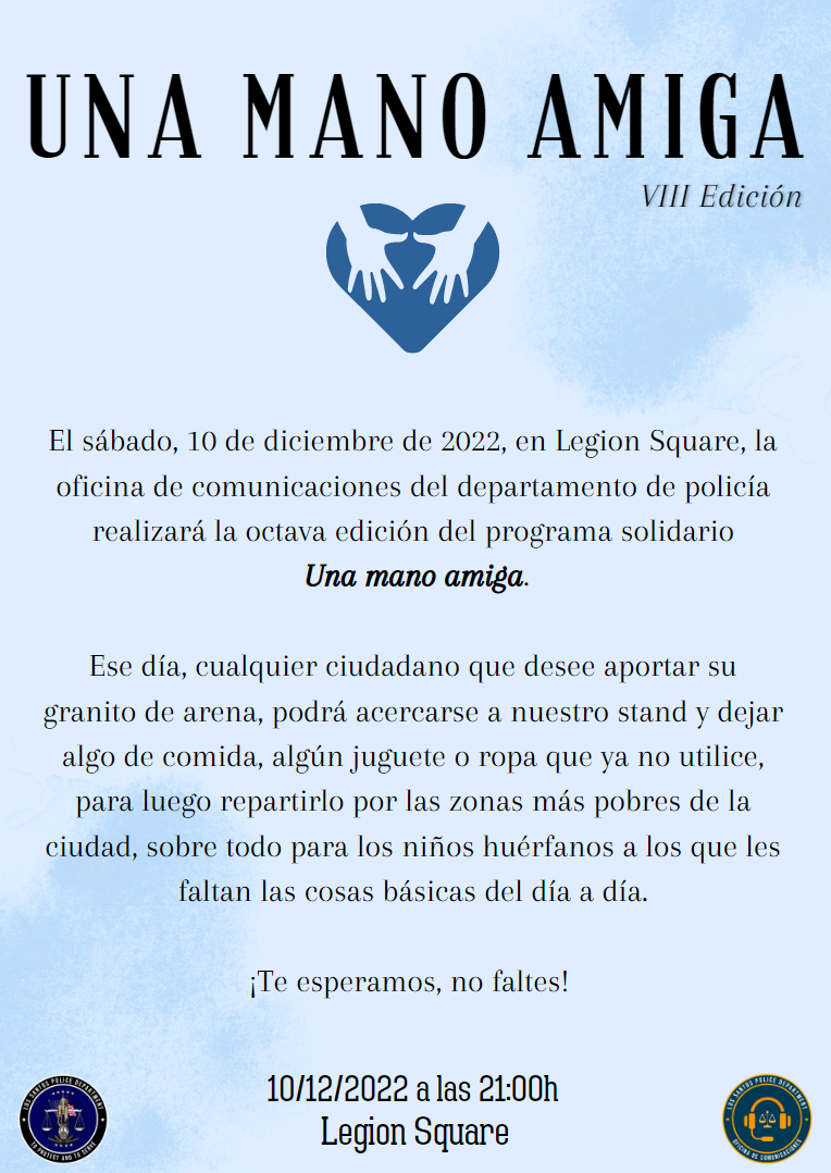 El departamento de policía, oficina de comunicaciones presenta la octava edición del tradicional "Una Mano Amiga", evento solidario de entrega de juguetes y alimentos en Legion Square, Phillbox Hill, para los más necesitados.
