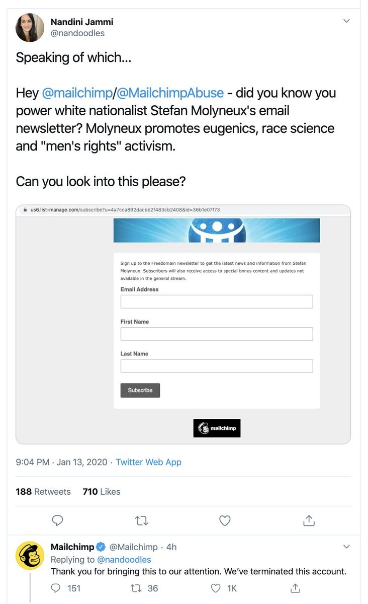 New #DOS vector spotted in the wild: Send #mailchimp an email accusing target of being a white supremacist. By morning they will have had their account terminated. Wow. Just wow.