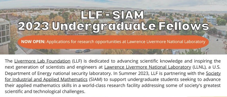 Applications for the @LivermoreLF - SIAM 2023 Undergraduate Fellowship are open! We're excited to be partnering with LLF this summer to support #undergrad #students seeking to advance their #appliedmath skills. Apply by February 15: https://sinews.siam.org/Details-Page/livermore-lab-foundation-siam-2023-undergraduate-fellowship. @Livermore_Lab