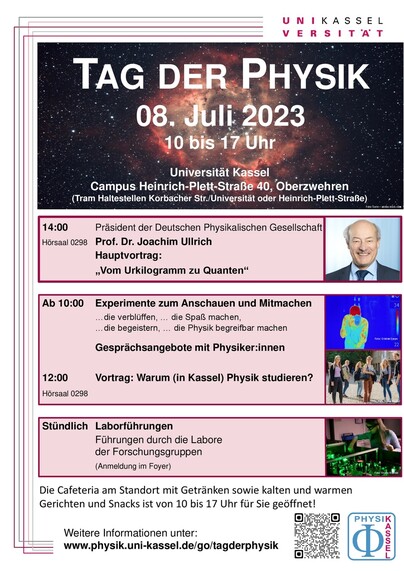 Ein buntes Programm für Neugierige aller Altersstufen bietet der „Tag der Physik” an der Universität Kassel. Veranstaltet wird er vom Institut für Physik am 8. Juli 2023 nach langer pandemiebedingter Pause: Von 10 bis 17 Uhr öffnet das Institut seine Türen für spannende Experimente und Einblicke in die Forschung. Eine Pressemitteilung der Universität Kassel. #unikassel #physik