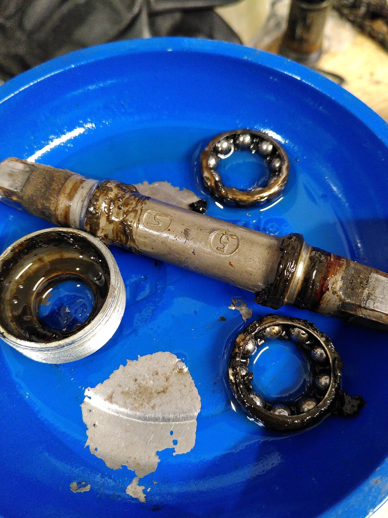 Tous mes clients ne sont pas des sagouins, ici une cliente avec un vieux Peugeot d'environ 40 ans qui a un peu de jeu dans le boîtier de pédalier. Je lui propose de lui faire un nettoyage et regraissage et à part le fait que la graisse était vieille et un peu séchée, c'était propre. #bikeMecanics #unJourOrdinaireAlAtelier