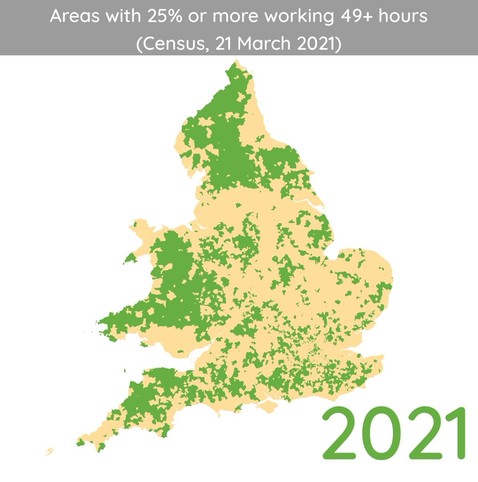 I also found the '% of full time workers working 49 hours or more' map interesting. I'd take a punt and say the answer is 'hard working farmers' but I'm not an expert on that - definitely not an urban pattern though