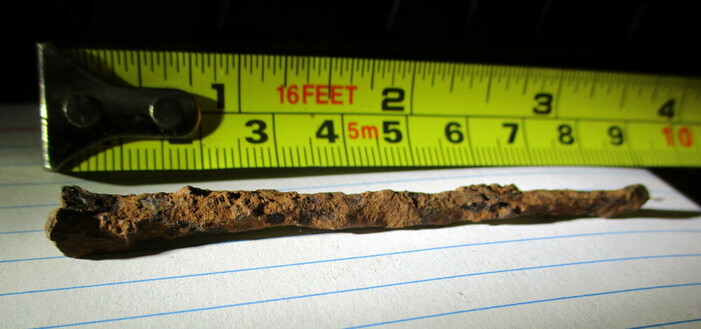 Against background of a white, blue-ruled, index card, a yellow tape measure shows 4 inches/ 10 centimetres. In front of it lies a 3 inch/ 7.5 centimetre iron nail, hand-forged, and hammered out square in cross-section.