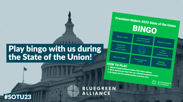 Creating millions of good union jobs; rebuilding and modernizing our #infrastructure; revitalizing #USManufacturing; and making our communities safer and healthier are among the top 5 things we hope President Joe Biden will highlight during #SOTU23. See more: https://www.bluegreenalliance.org/resources/state-of-the-union-2023-bingo/