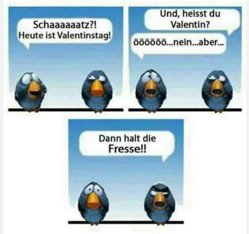 Heute ist Dienstag und Valen:dingens:diens:tinstag. Ausgesprochen wird er übrigens „Walentinstag“ und nicht „Falentinstag“. Im Gegensatz zu Karl V:F:alentin 🗨️ "Es heißt ja auch Vogel und nicht Wogel“ 😁 !Merkt euch das jetzt endlich mal, ihr Lingu:banaus:innen!