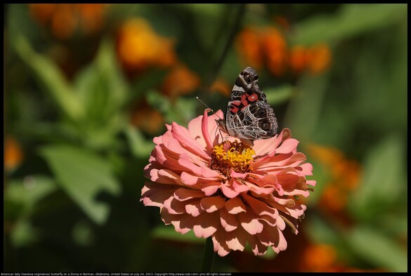 American lady (Vanessa virginiensis) butterfly on a Zinnia in Norman, Oklahoma, United States on July 24, 2023