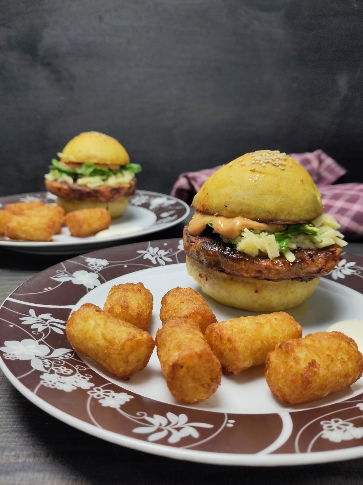 Tempeh-Burgerpatty mit selbstgemachten Burgerbuns, Rucola, veganen Käse und Kroketten.