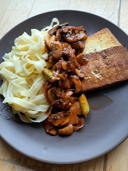 Tagliatelle an geschmorten Pilzen und dazu Filet vom Tofutier