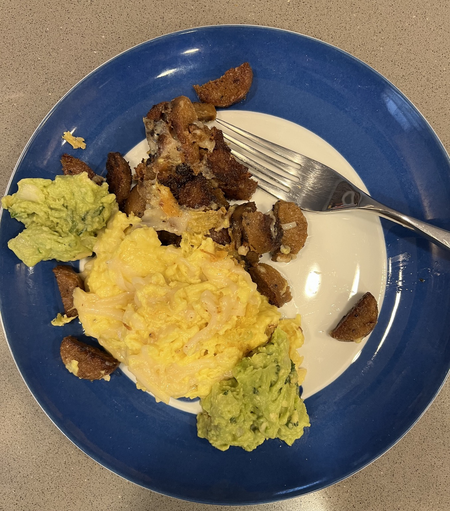 The morning after: Treated myself to a Just Egg scramble with Field Roast apple-sage sausage, Forager queso fresco and a side of guacamole. Vegan foods have come a long way baby. Super-nom. (Plus leftover cake natch.) #vegan #whatveganseat #vegansofmastodon #mastovegan #veganodon