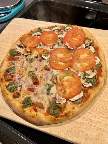 Pizza! Tomato sauce, red onion, crimini mushrooms, pesto, Field Roast sausage, Daiya mozzarella, and tomato slices on fresh yeasty homemade pizza dough #WhatVegansEat #Vegebruary