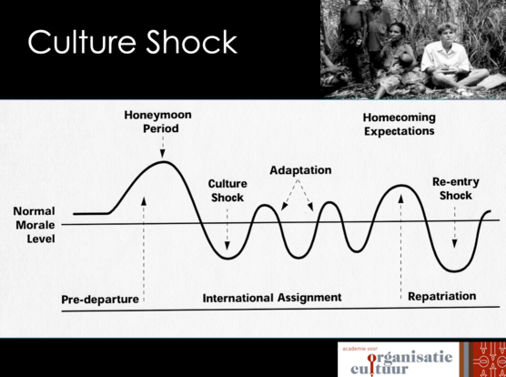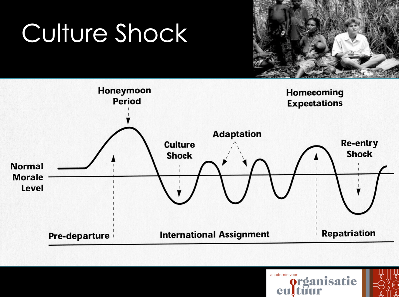 Culture-Shock verloopt in fases en met ups- en downs. Van 'oh wat gaaf die andere cultuur' via 'mag ik al naar huis' tot aanpassen, bi-culturaliteit en uiteindelijk een terugkeershock. #leergangcorporateantropologie #veldwerk
