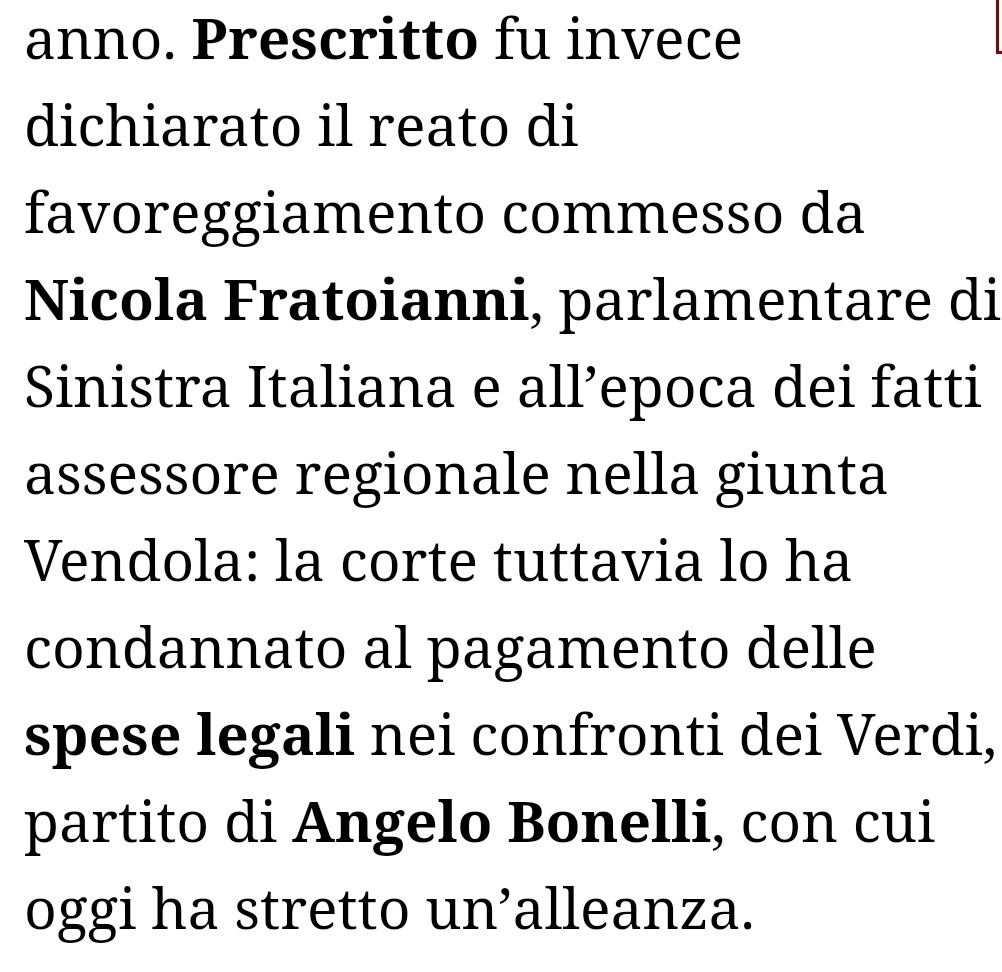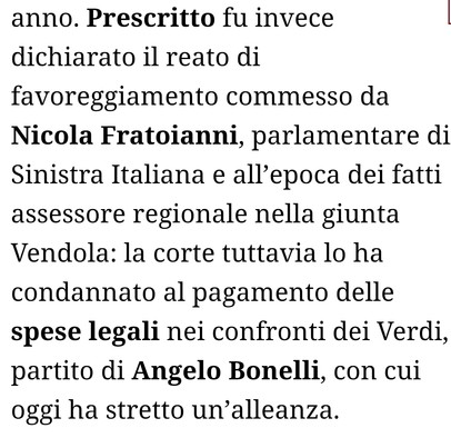 Prescritto il reato di favoreggiamento per Nicola #Fratoianni, di Sinistra Italiana, all'epoca assessore regionale della giunta #Vendola. Anche questo stralcio è tratto dal sito del Fatto Quotidiano di oggi, articolo di Francesco Casula.