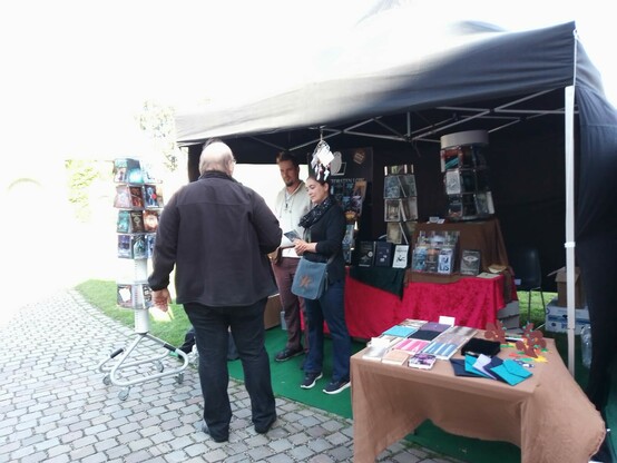 Auf jeden Fall freuen wir uns, wieder hierzusein. Lauter coole Leute hier, nette Stand-Nachbarn von "Schwarzes vom Feinsten", Christian von Aster hat uns schon am Stand besucht.