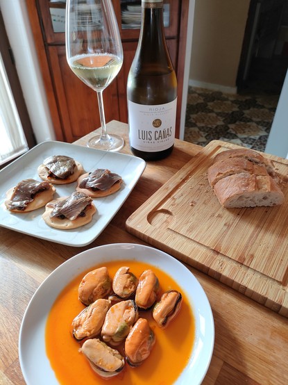 Ay, que ya llegó la hora del #vermú en #CasaLillo 😋 Con lomos de sarda ahumada en tostas de pipes i carasses, mejillones de Ramón Franco y una copa de blanco de cepas viejas de Rioja de Luis Cañas 🥂