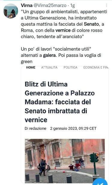 Parere mio, il governo dovrebbe dare un premio ai membri di #ultimagenerazione: sì, perchè imbrattando il #senato con della #vernice, han fatto sì che il popolino si distraesse e non pensasse, almeno per qualche giorno, allo schifo che stan facendo. Chi se ne frega degli aumenti della benzina, dei decreti "sicurezza, della stessa emergenza ambientale? Mettete in galera questi pericolosi sovversivi.