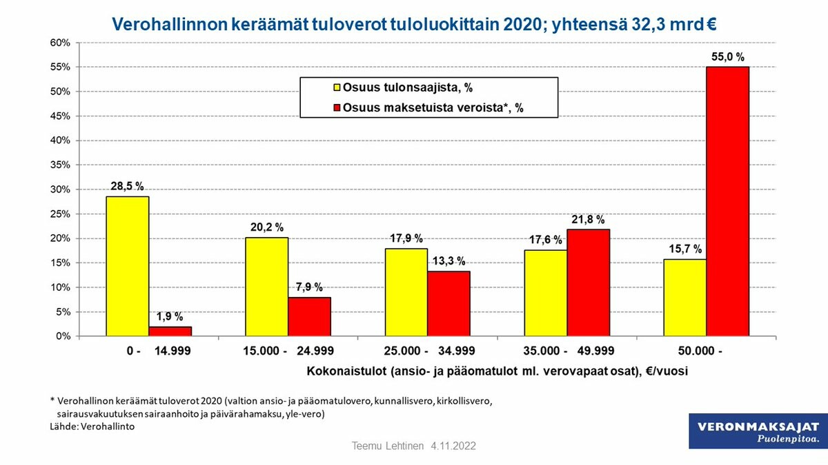 Tuloja ja veroja tutkaillessa on hyvä muistaa myös iso kuva: suhteellisen harvalukuiset hyvätuloiset maksavat suuren osan tuloveroista.