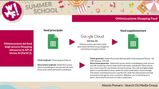 🦾 Ieri, durante l'#AI Summer School, abbiamo visto come si possa creare un'infrastruttura basata sulle API di Vertex AI di Google (usando #PALM2) per ottenere un'ottimizzazione del feed per gli annunci Shopping.