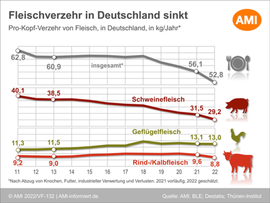 Der #Verzehr von #Fleisch in #Deutschland entwickelt sich rückläufig. Die vorläufigen Zahlen für 2022 weisen einen durchschnittlichen Verzehr von 52,8 kg pro Kopf und Jahr aus. Das entspricht einem Rückgang von 13 % innerhalb von vier Jahren.🍗🥩🥓 https://bit.ly/3WmQQhy