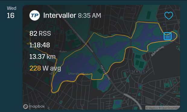 Hård tur i dag med intervaller på grænsen, specielt sidste km med højt tempo var hård. Og jeg lagde ud for hurtigt 🤦