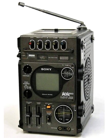 Sony FX-300 Jackal from 1978. Has a mini CRT television screen, precision analog tuning, top-mounted cassette player/recorder, AM/FM reception, built-in speaker, and earphone/mic external ports.