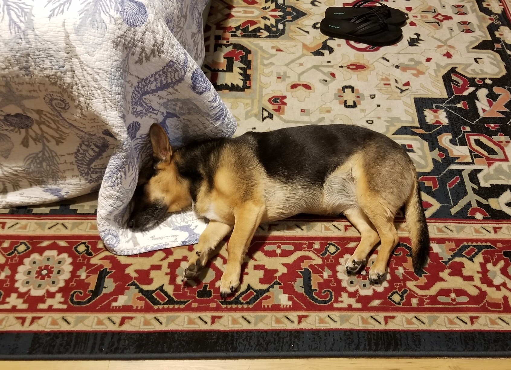 #Violet has at least a few more days of crate rest to make sure she doesn't re-injure her neck, but she's feeling fine. In fact, she's getting a bit stir-crazy. "But DAD, why can't I hunt squirrels in the back yard and, when they run up the fence, hurl myself into the air like a salmon?"