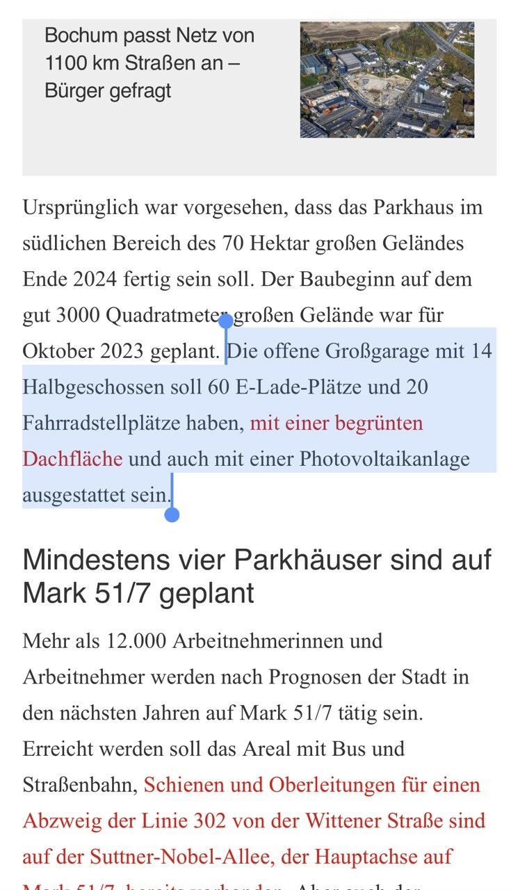 Hierbei finde ich es enttäuschend dass beim Neubau des Parkhauses für ein Krankenhaus, in Heikes Wohnnähe, die Stadt nicht mit aufgesprungen ist und zusammen mit der Knappschaft eine Kombination aus Besucher:innen, Mitarbeiter:innen und Quartierparkhaus gestaltet hat.