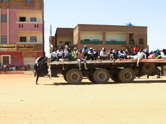 📷: ผู้คนต้องนั่งท้ายรถบรรทุก ทางตอนใต้ของคาร์ทูมเมืองหลวงซูดาน เพื่อลี้ภัยจากการสู้รบระหว่างกองกำลังของนายพลซูดานที่แบ่งเป็น 2 ฝ่าย ซึ่งเป็นเหตุรุนแรงที่ปะทุขึ้นเมื่อวันเสาร์ที่แล้ว