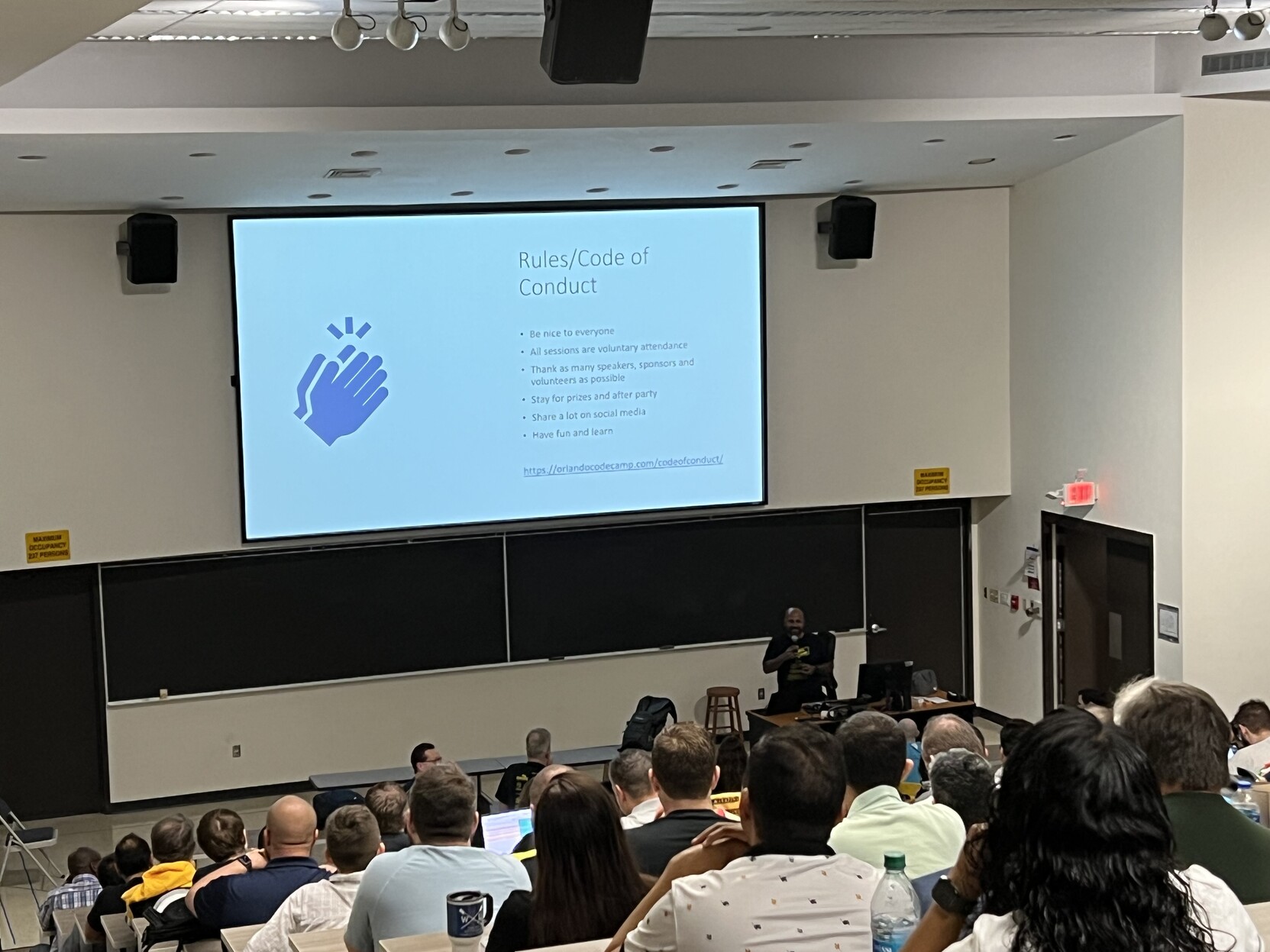 @santoshhari kicks off Orlando Code Camp. Shows his black T-shirt as example of volunteer and encourages crowd to thank them. #OrlandoCC #volunteersrock