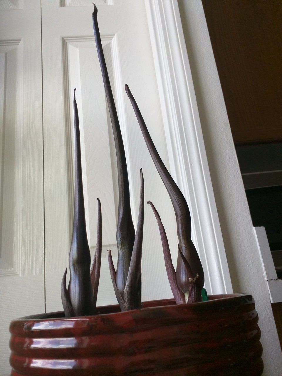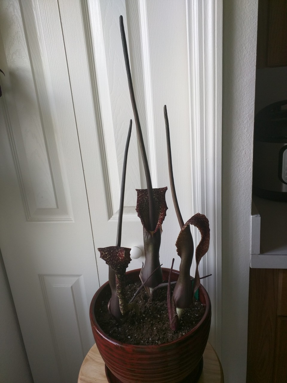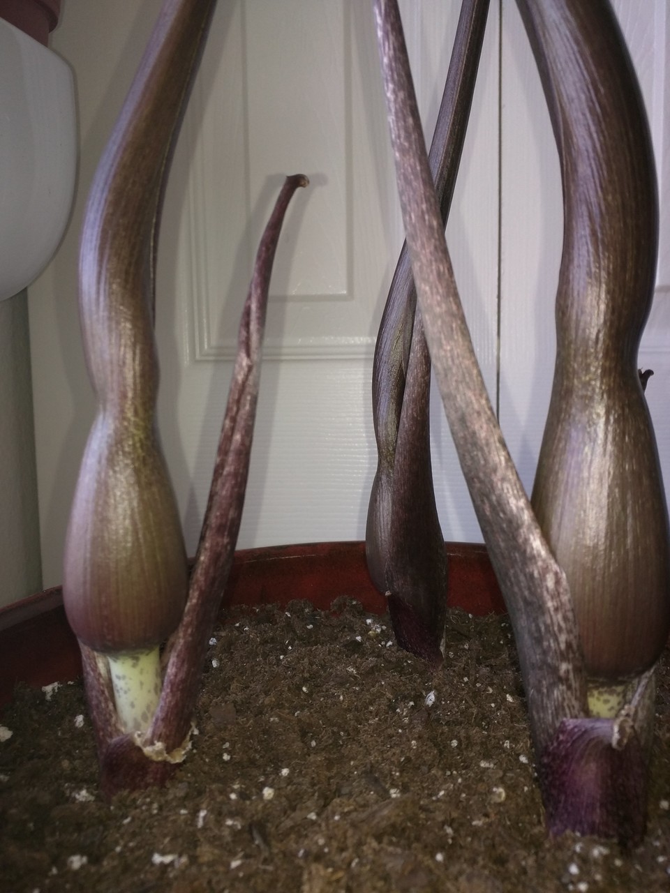 The flowers have opened. They are gorgeous, macabre, and alien. The smell is like being trapped in a hot, under-maintained barn croweded with ungulates. The tallest is 25" so it averaged 1.25" in growth per day.
