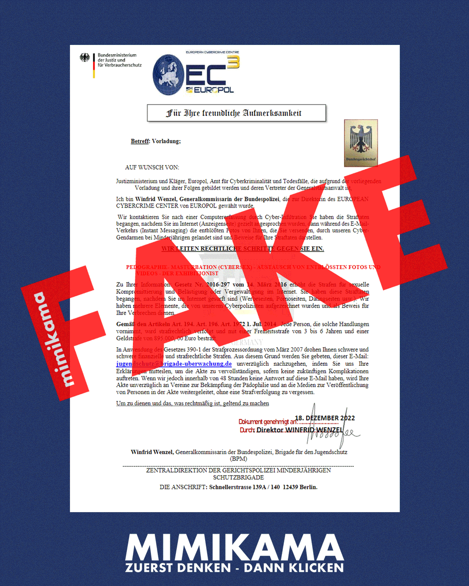 "Zentraldirektion der Gerichtspolizei minderjährigen Schutzbrigade" - Noch Betrug oder schon Satire?
