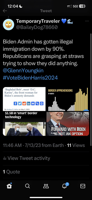 Southern border illegal immigration is down 90%. Biden admin is doing a great job. https://twitter.com/baileydog78660/status/1679532771499204609?s=46 #VoteBidenHarris2024