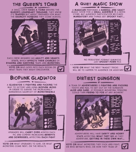Subscribers (all tiers) are voting now to declare the next nsfw horrorporn art series I'll be working on ๐