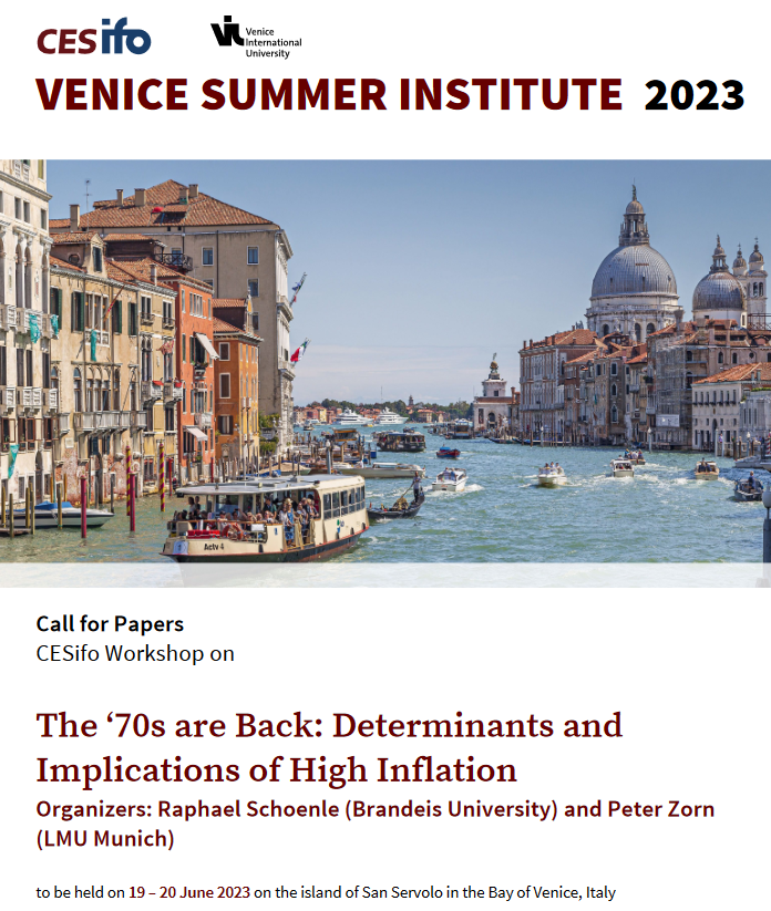 Call for papers: Venice Summer Institute 2023: The ‘70s are Back: Determinants and Implications of High #Inflation 19–20 June 2023 - keynotes: @LeinSarahMarit@twitter.com @R2Rsquared@twitter.com (inv.) - sc. org.: Raphael Schoenle @BrandeisU@twitter.com Peter Zorn @LMU_Muenchen@twitter.com #VSI @univiu@twitter.com https://www.cesifo.org/en/event/2023-06-19/venice-summer-institute-2023-70s-are-back-determinants-and-implications-high