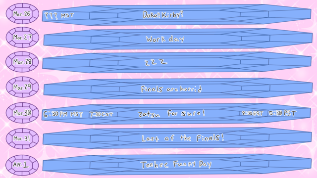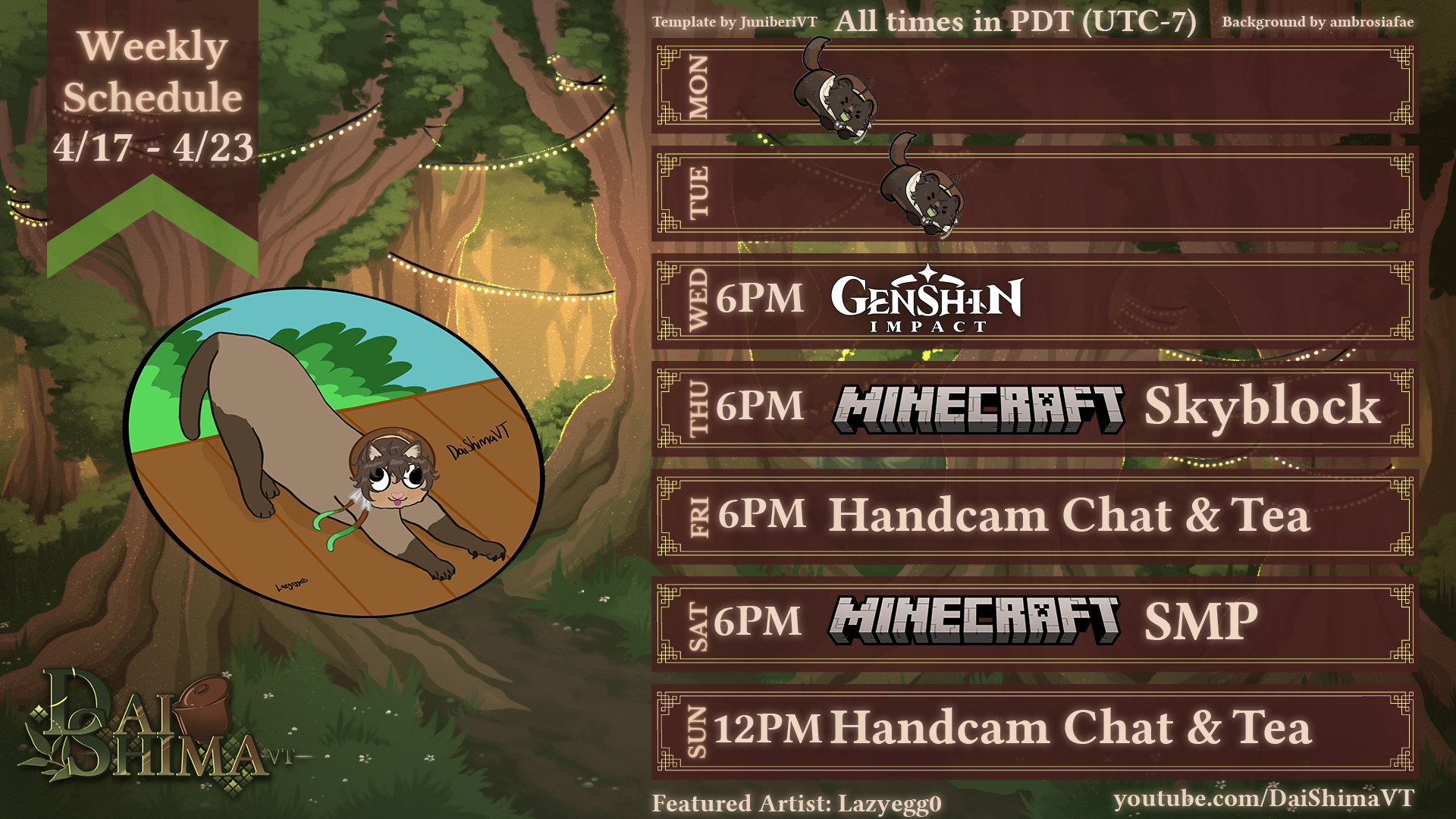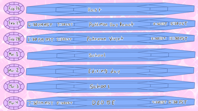 Hey guys a new schedule is up! I can't wait to see you at the next stream!